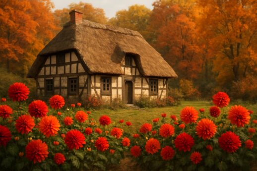 Ein idyllisches altes Bauernhaus mit Fachwerkfassade und Strohdach, umgeben von einer malerischen Herbstlandschaft, fotorealistischer Stil, leicht erhöhte Perspektive, bunter Laubwald im Hintergrund, üppiges Dahlienbeet in Rot- und Orangetönen im Vordergrund, detaillierte Holz- und Blütentexturen, friedliche Landatmosphäre, natürliche Tiefenunschärfe.